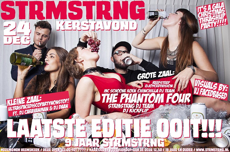 In de grote zaal openen de godinnen van de decks, DJ REEFSTEEF en DJ JOYCEDIVISION de avond met een lekker rauw en sleazy setje alternatieve rockhitjes, classics, partytrash en supervette electrobangers! Daarna neemt het CHINCHILLA DJ TEAM het van ze over met een zeer gevaarlijk dansbaar mixje van obscure indie, punk, electronica en R&B. Vervolgens spelen de PHANTOM FOUR, waarna voor de allerlaatste keer op hun eigen feestje het STRMSTRNG DJ TEAM een alcoholpocalypse op de dansvloer gaat veroorzaken. Verwacht naast de bekende hitjes/indie/classics/90’s en 80’s/electro/hiphop ook de obscure indiedance tracks waar ze mee begonnen zijn. Als afsluiter hebben we onze lokale HELD en fulltime überpositivo DJ KICKFLIP die de dansvloer in no time verandert in een grote daggerende kerstorgie! UK Garage, R&B Classics, HIPHOP, alles gaat hij draaien. Mad respect voor onze favoriete vogelfluisteraar en dus voor de laatste keer op een STRMSTRNG feessie! VJ FACEDBASED visualiseert de hele avond de visualisaties!